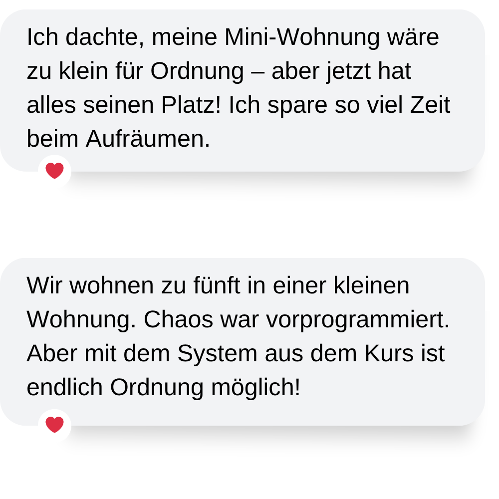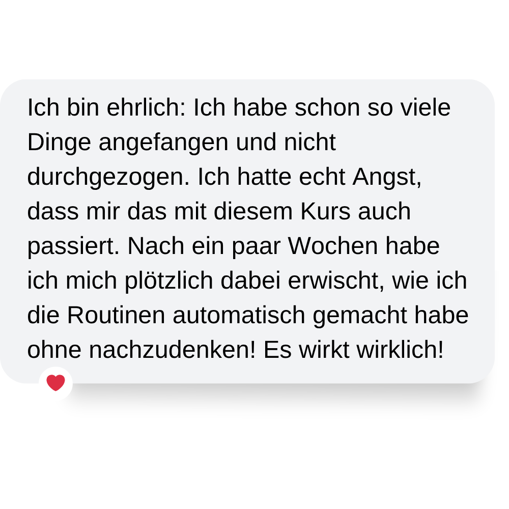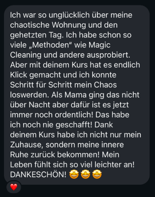 Dianas Ordnungskurs hat mir geholfen, eine Routine zu entwickeln, die wirklich zu meinem hektischen Leben passt. Ich fühle mich nicht mehr ständig überfordert und habe sogar wieder Zeit für mich.