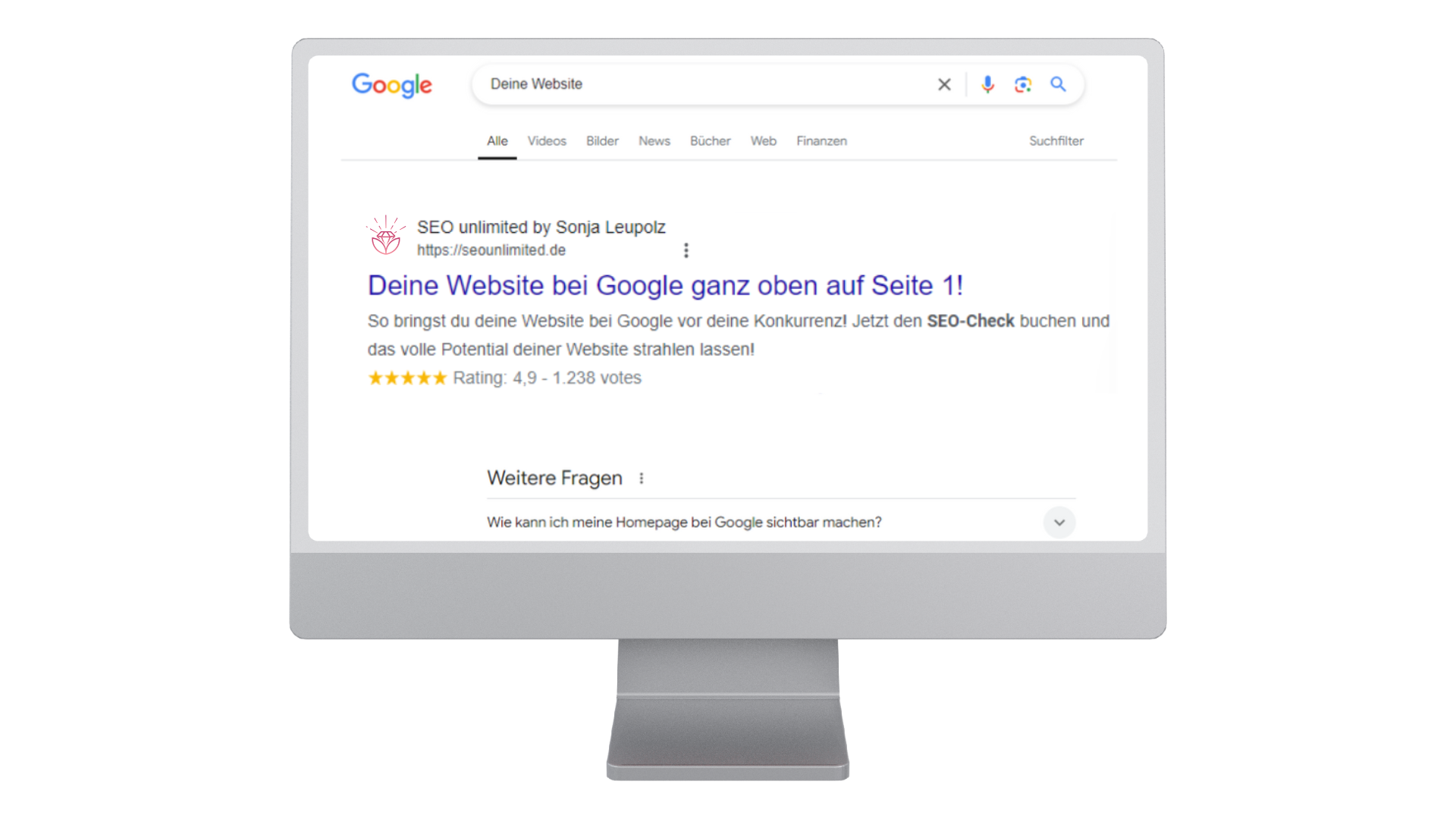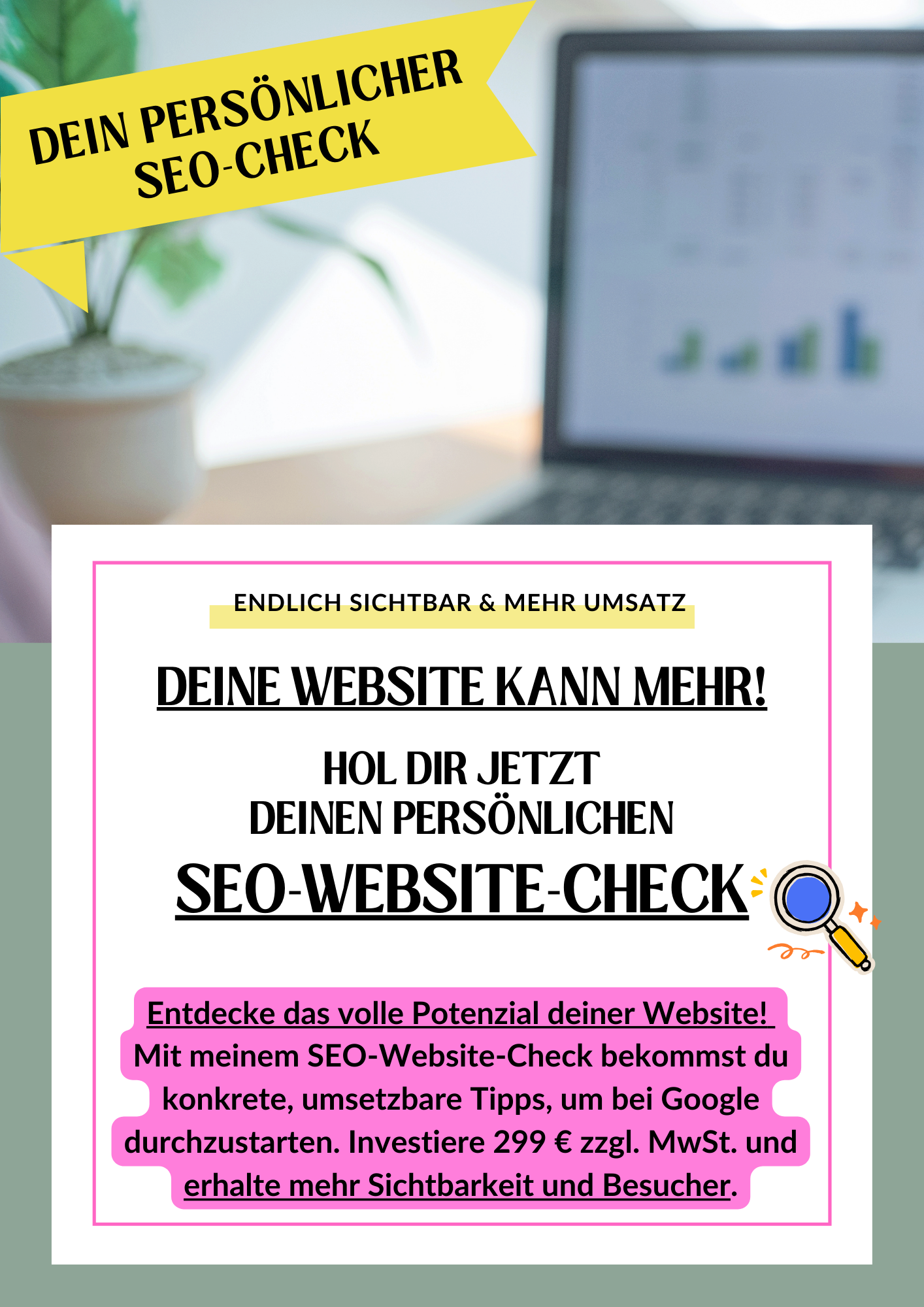 Lass uns das gemeinsam herausfinden! Mit meinem individuellen SEO-Website-Check analysiere ich deine Website gründlich und gebe dir konkrete, umsetzbare Tipps, wie du bei Google nach vorne kommst. Du bekommst nicht nur eine Analyse, sondern einen echten Fahrplan zur Verbesserung.
