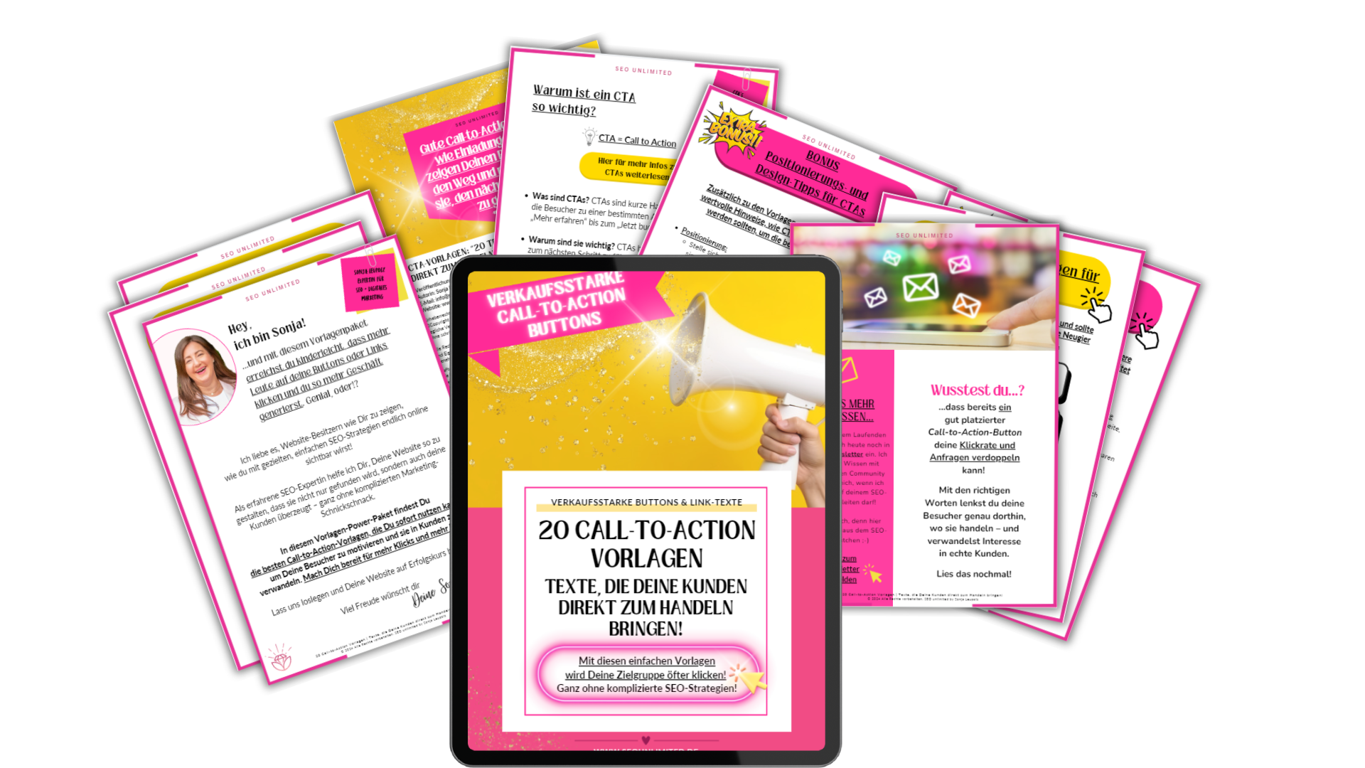 Dieses CTA-Vorlagenpaket ist ideal für Solo-Selbstständige, Unternehmer und alle, die ihre Website-Besucher direkt zum Handeln motivieren möchten – ohne großen Aufwand und ohne Marketing-Vorkenntnisse. Ob Startseite, Angebotsseite oder Blog – hier findest Du für jede Seite die passende Handlungsaufforderung.