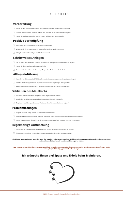 Du bekommst kompakte, klar strukturierte Anleitungen, wie du deinem Hund hilfsmittelfreundlich und in kleinen Schritten beibringst, Maulkorb und Halti gern zu tragen – mit Ruhe, Sicherheit und Vertrauen.