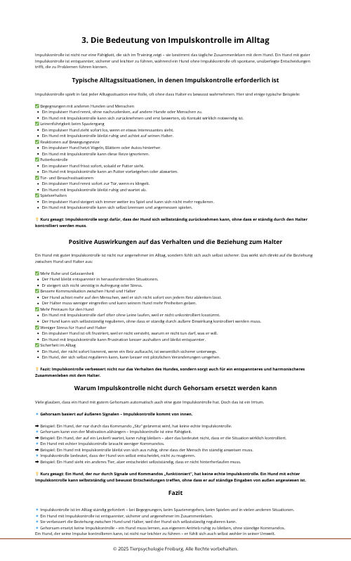 Typische Alltagssituationen – von Begegnungen an der Leine bis zum Warten an der Tür – werden praxisnah beleuchtet. So lernst du, dein Training realistisch einzuordnen und echte Fortschritte zu erkennen.