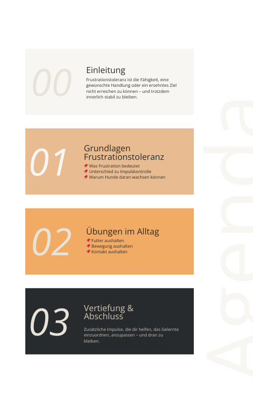 Im Fokus stehen keine Kommandos, sondern die Entwicklung innerer Stabilität: Wie dein Hund lernt, mit unerfüllten Wünschen umzugehen – ohne Stress, Überforderung oder Dauermanagement.