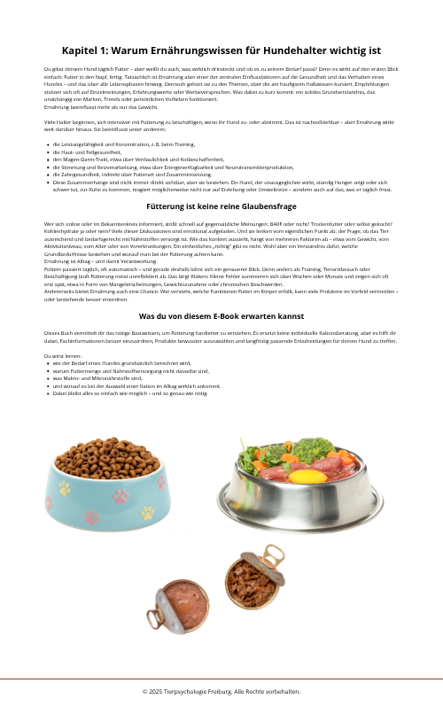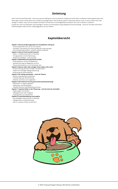 Was braucht ein Hund wirklich – und was ist nur Marketing? Dieses E-Book vermittelt dir das grundlegende Wissen über Nährstoffe, Bedarfswerte und Futterbewertung – klar, sachlich und ohne Ideologie.